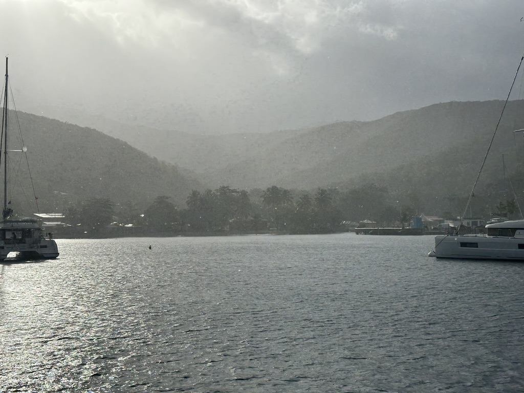 Rain hangs in the valleys above the harbor. We make bets with ourselves - will this one get us or will we stay dry? A squall hits the middle of the night. We get up to close the hatches. Later we’re hot and get up to open them again. It rains some more so we get up again. Rinse. Repeat An old Open 50 racing boat arrives with a young couple on board. They launch a tiny dinghy and he rows them ashore. We never see her again. Next morning he rows ashore furiously fast, with a cigarette clenched firmly between his teeth. We speculate what the story there is. A hen and her chicks peck along the beach by Le Paradise restaurant. What are they finding in the sand? A very large dog chases a rooster along the beach. No one seems to care, except perhaps the rooster.